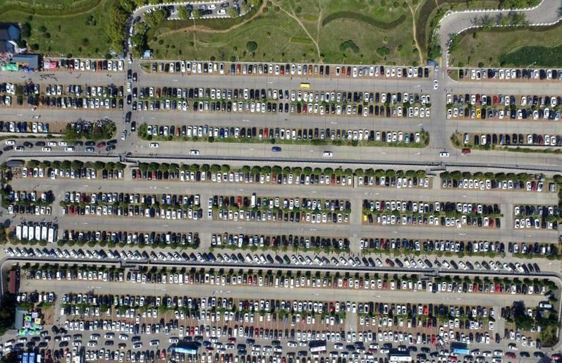 景區(qū)內(nèi)各大停車場內(nèi)也是密密麻麻,近萬輛汽車停放在一起,猶如電路板,甚是壯觀。